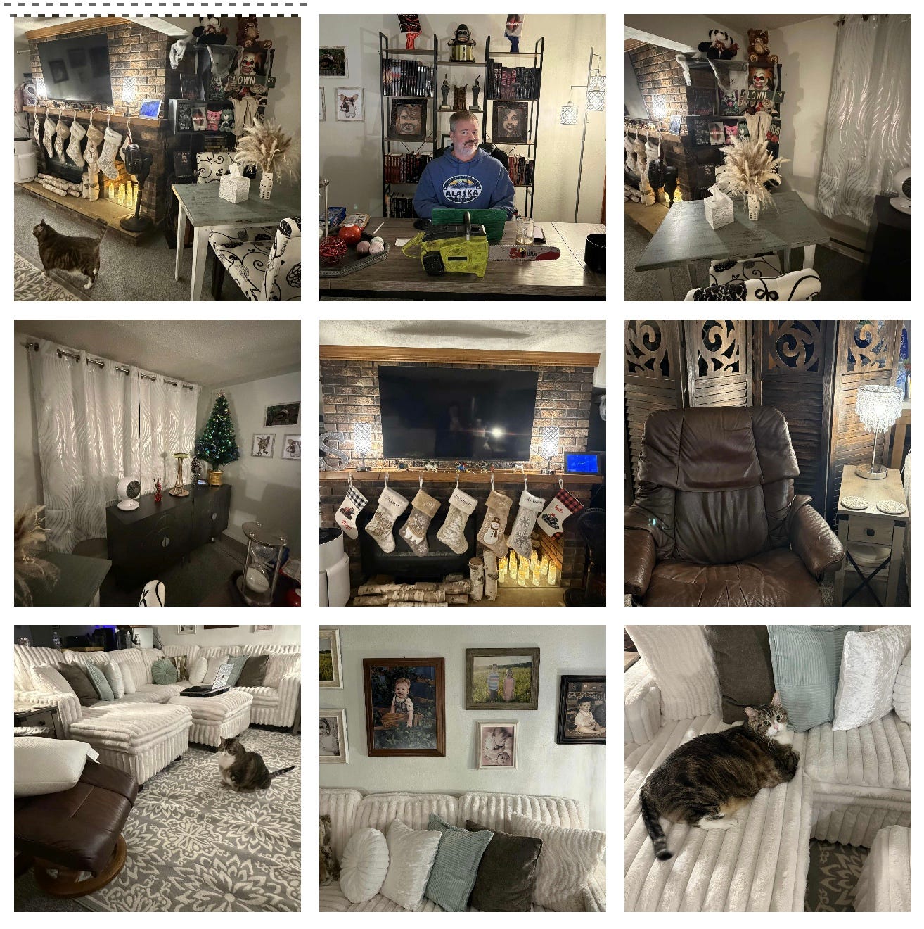 As for the photos of our new living area, I promised you those, didn’t I? Not one to go back on my word, here you go! We got a new sectional sofa, an area rug, end tables, a desk/desk chair, a credenza, several lamps, a room divider, thermal curtains, tons of throw pillows, and a couple storage shelves for the bathroom. I love our sofa so much. It’s so comfy and soft. I may replace the area rug. No matter what we do, it wads up. Chaos made sure he was in many of the photos.